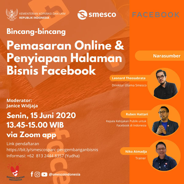 Pemasaran Online & Penyiapan Halaman Bisnis Facebook adminsmesco June 13, 2020 Video 11 Bersama Leonard Theosabrata – Direktur Utama Smesco. Ruben Hattari – Kepala Kebijakan Publik Untuk Facebook Indonesia. Niko Atmadja – Trainer Moderator: Janice… Read More