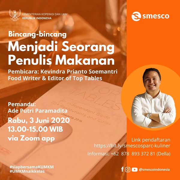 Menjadi Seorang Penulis Makanan admin-smesco May 31, 2020 Video 9 Bincang-bincang dengan Kevindra Prianto Soemantri, Food Writer & Editor of Top Tables ?Rabu, 3 Juni 2020 ?13:00 – 15:00 Pemandu: Ade Putri… Read More