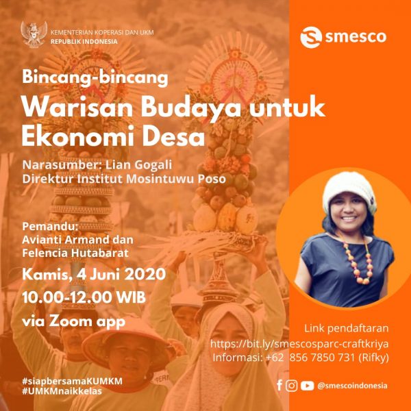 Warisan Budaya Untuk Ekonomi Desa adminsmesco June 3, 2020 Video 9 Bincang-bincang dengan Lian Gogali – Direktur Institut Mosintuwu Poso Kamis, 4 Juni 2020 10:00 – 12:00 Pemandu: Avianti Armand dan Felencia Hutabarat… Read More